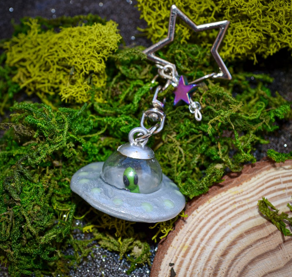Handmade Polymer Clay Keychains that feature these cute lil Aliens piloting these UFOs! These UFOs also glow in the dark in certain areas <3